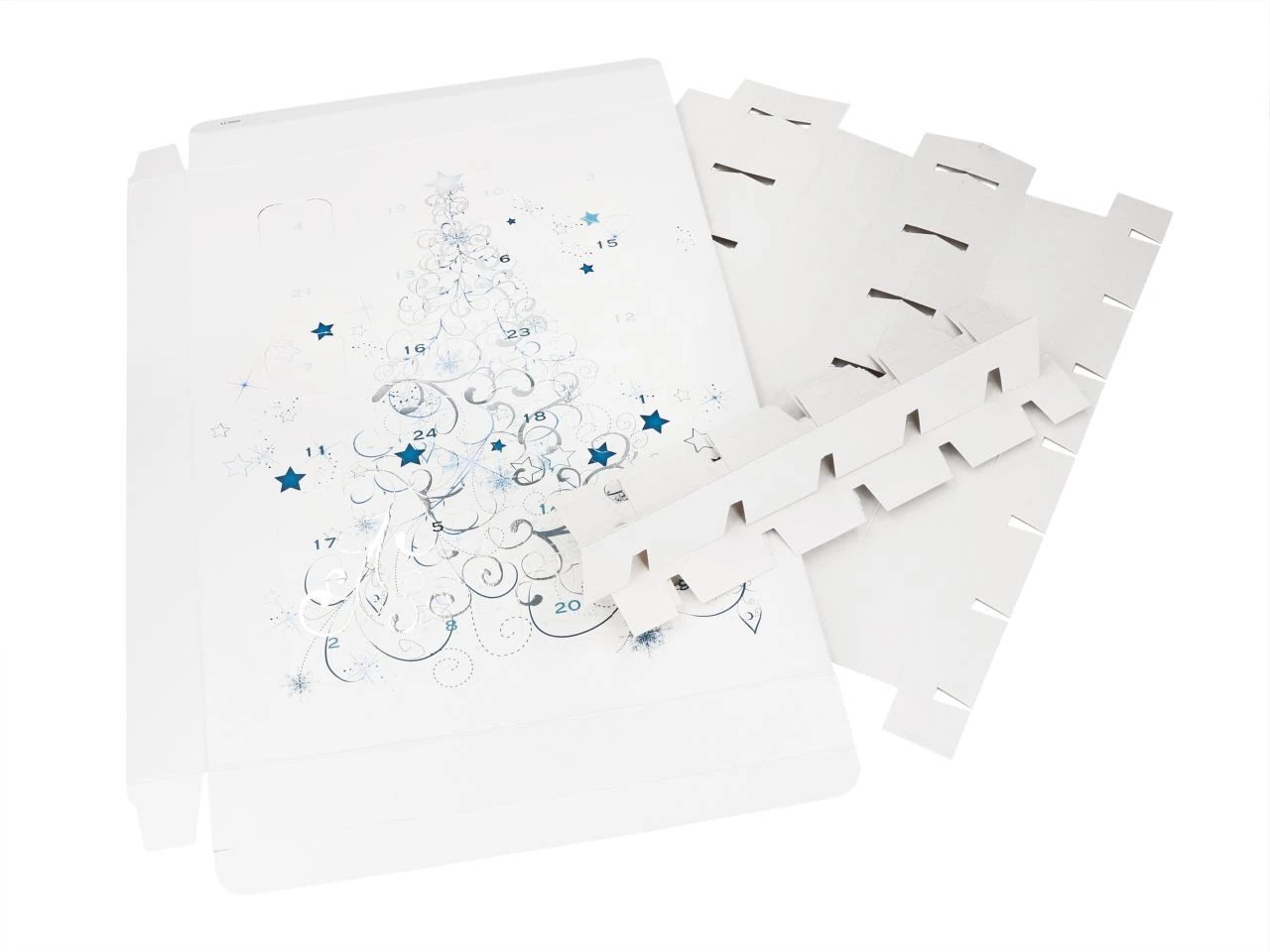 Toller Adventskalender zum Selberfüllen. Ideal als Geschenk oder für sich selbst. Er ist aus Papier und wurde aufwendig bedruckt mit Weihnachtsbaummotiv in Blautönen und silbernen Elementen.