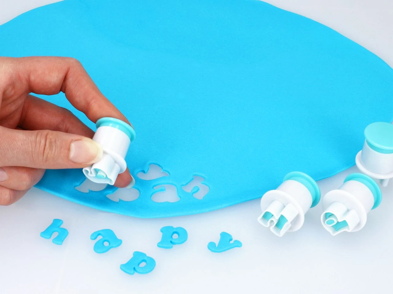 Produktinformationen „Ausstecher-Set mit Auswerfer: Alphabet Kleinbuchstaben, Kunststoff, Weiß & Türkis, 26 Stück (a-z) á 11 bis 17 mm“