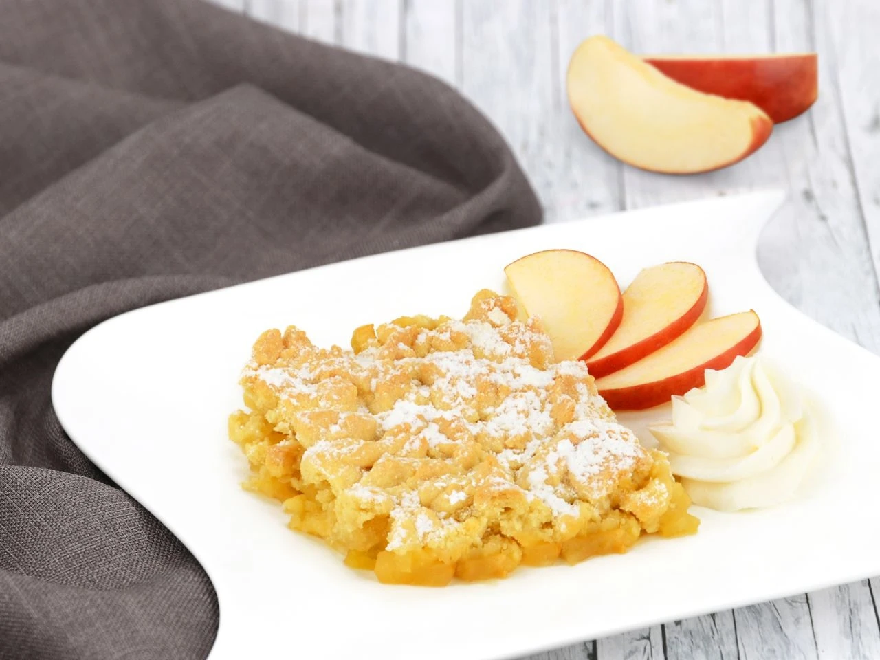 Der Apple Crisp reicht für acht bis zehn Portionen und Sie geben lediglich zimmerwarme Butter, Äpfel und Zitronensaft hinzu. Serviert wird Apfel-Crumble klassisch warm, mit Vanillesauce, frischer Schlagsahne oder einer Kugel Vanilleeis.