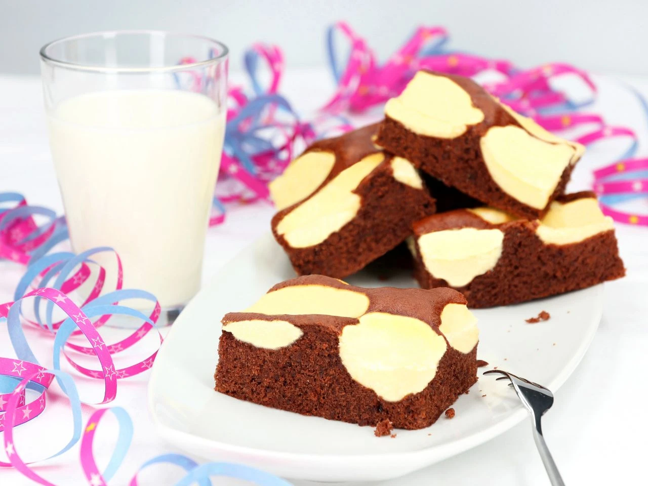 Sie geben der jeweiligen Fertigmischung für Schoko-Käsekuchen lediglich Eier, Speiseöl, Wasser, Magerquark und Butter hinzu. Die Choco-Cheese-Cake-Mischung reicht für einen Blechkuchen mit den Maßen 28 cm x 32 cm.