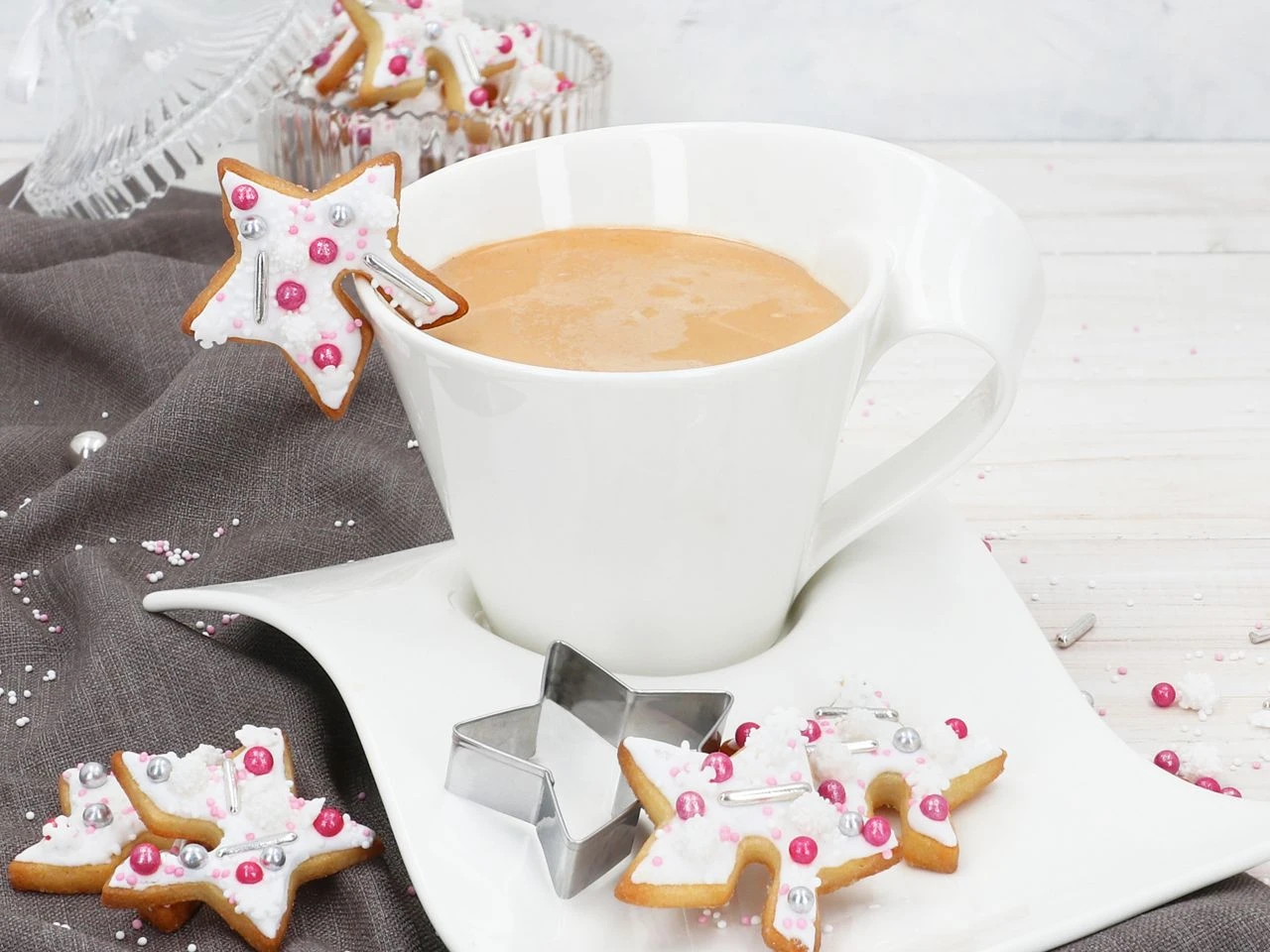 Sie geben der jeweiligen Fertigmischung für das Stern-Kaffeegebäck lediglich zimmerwarme Butter, ein Ei und etwas Wasser hinzu. Gegebenenfalls benötigen Sie etwas Mehl zum Ausrollen des Plätzchenteigs. Die Fertigbackmischung reicht für ca. 100 Tassen-Cookies.
