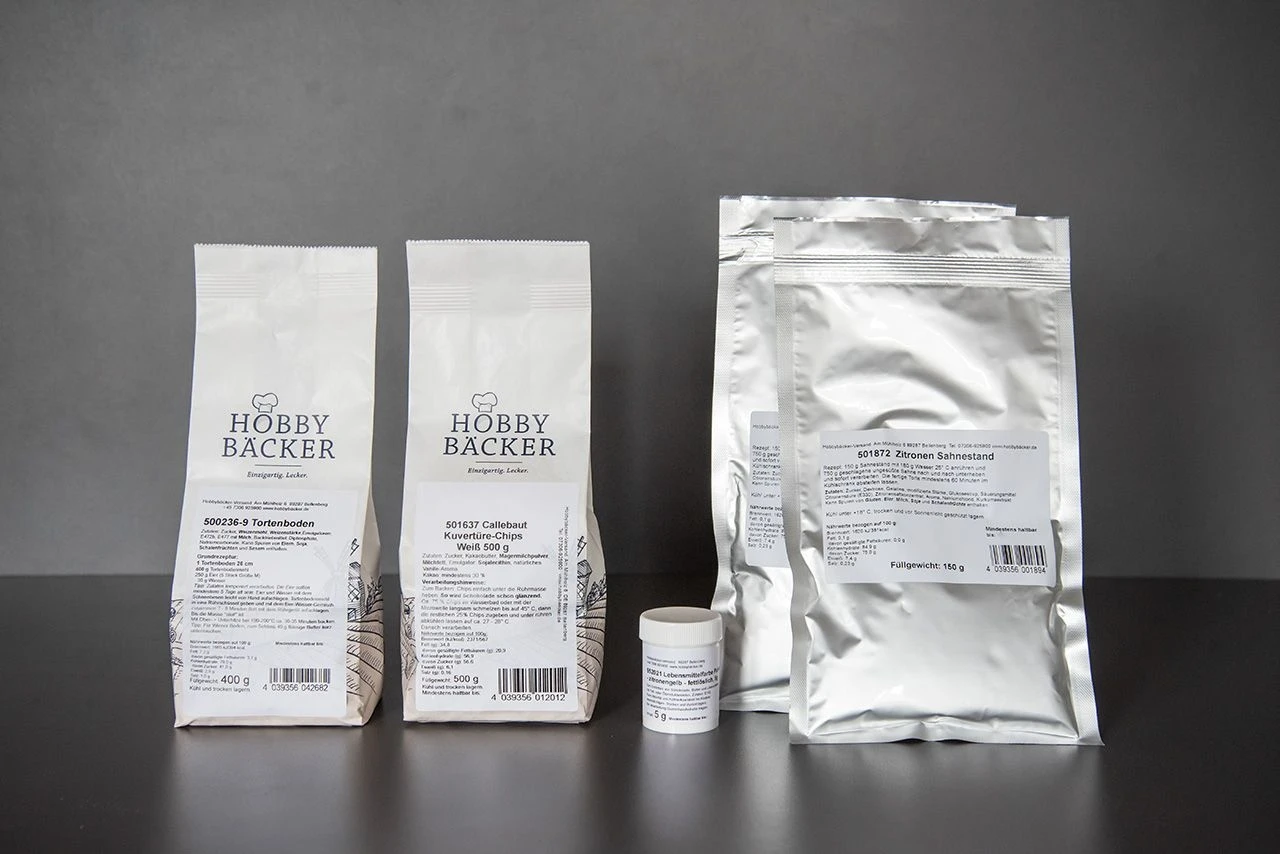 Mit der Backmischung für Tortenboden backen Sie die locker luftige Grundlage. Der Zitronen Sahnestand gibt der Torte den besonderen und einzigartigen Geschmack. Auch Kuvertüre-Chips und zitronengelbe Lebensmittelfarbe fehlen selbstverständlich nicht.