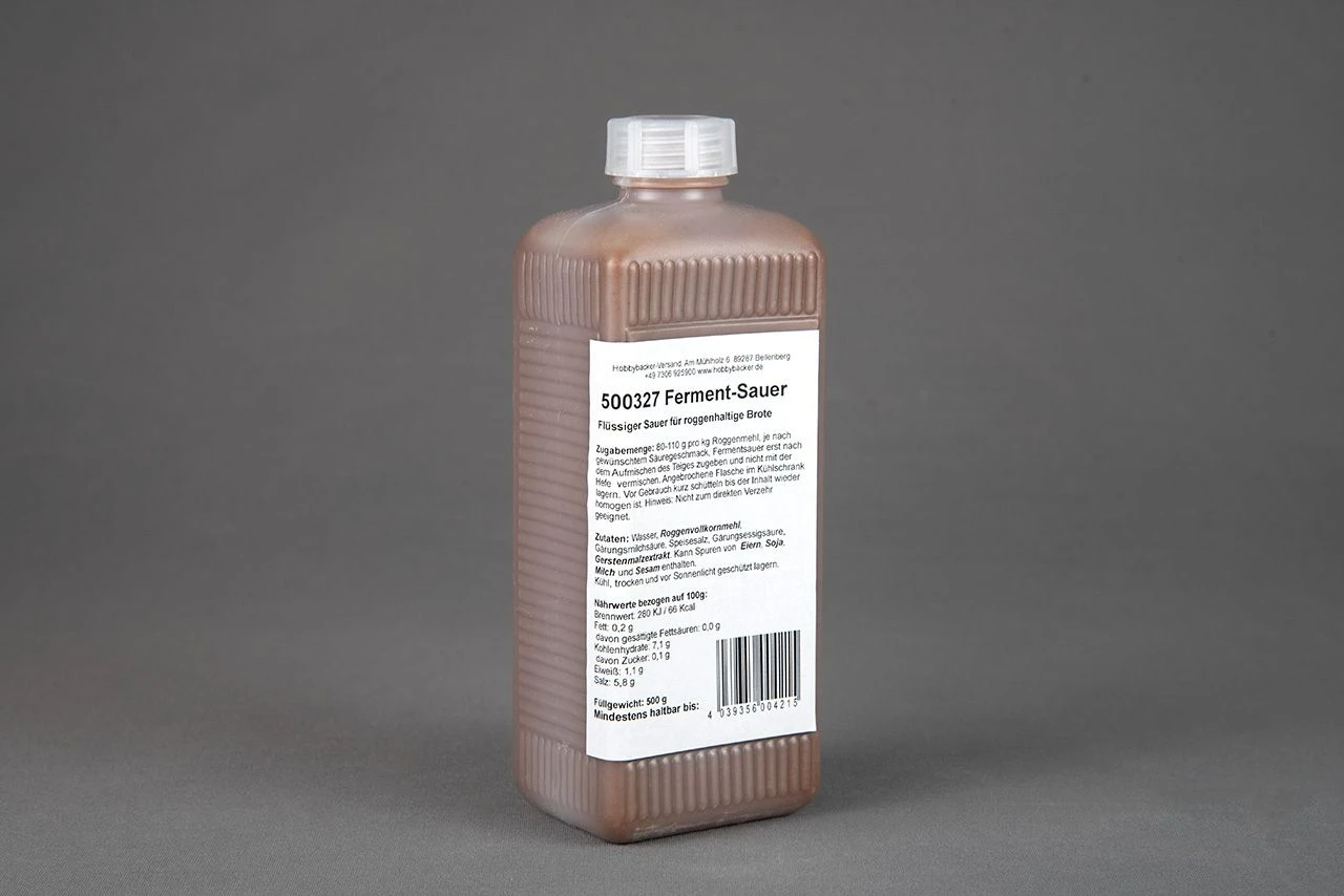 Fermentsauer ist ein flüssiger Sauer, mit dem sich alle roggenhaltigen Brotsorten backen lassen. Er ersetzt die Sauerteigherstellung. Damit gebackene Brote krümeln nicht, lassen sich gut aufschneiden, haben eine lange Frischhaltung und schmecken kräftig abgerundet. Mit der Zugabemenge steuern Sie den gewünschten, säuerlichen Geschmack: Geringere Zugabemenge bei hellen Mehlen und kleinen Broten mit milderem Sauerteiggeschmack. Höhere Zugabemenge bei dunklen Mehlen, Vollkornmehlen und großen Broten (Bauernlaib) mit kräftigerem Sauerteiggeschmack. 10 g Fermentsauer ersetzen ca. 100 g Sauerteig oder 50 g flüssigen Sauerteig aus dem Beutel.