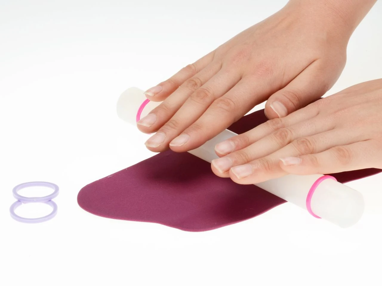 Die abnehmbaren Abstandshalter des Kunststoff-Rollholzes, bestehend aus je zwei Ringen mit 2 mm und 4 mm, helfen beim Ausrollen der präzisen Höhe der Tortendecke.
