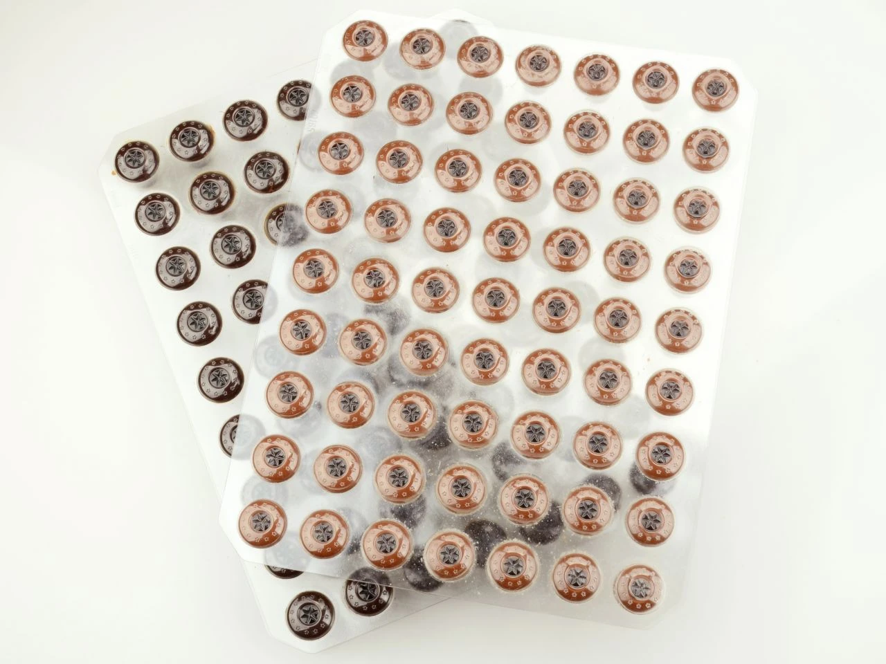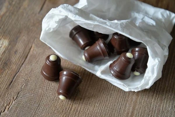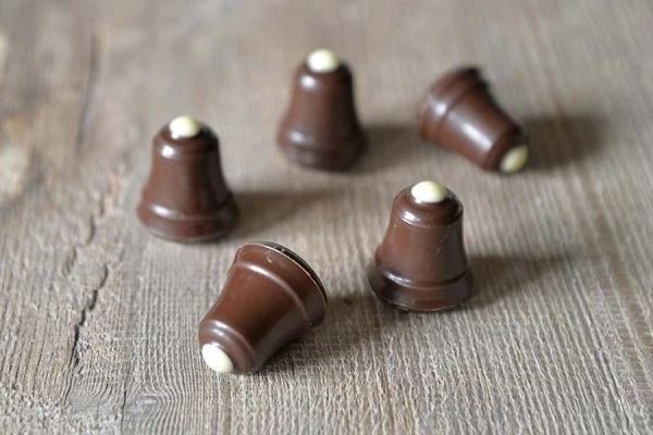 Feine Hohlkörper aus Zartbitterschokolade in Glockenform – ein festliches Gewand für Ihre selbst gemachten Pralinen. Einfach füllen, verschließen, genießen.