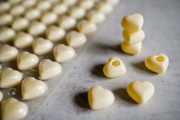 Wer lässt sich da nicht gerne verführen? Herzpralinen aus feiner weißer Schokolade zum Selberfüllen. Ein selbst gemachtes Geschenk, das von Herzen kommen.