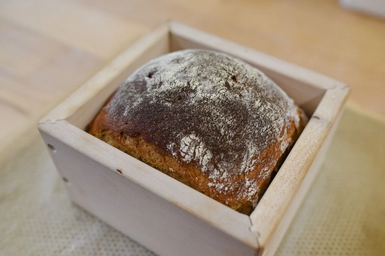 Sie lieben saftiges Brot mit krustenlosen Seitenflächen und einem ganz besonderen Aroma? Dieser Rahmen aus heimischem Ahornholz isoliert Ihren Teig an den Seitenflächen und verhindert hier die seitliche Krustenbildung. Weil die Backhitze nur von oben und unten wirkt, erzielen Sie fast die doppelte Backzeit – und genau darin liegt das Geheimnis! Die sorgfältige Schreinerarbeit gibt dem Rahmen beim Backen besondere Stabilität. Für Mischbrote, Roggenmischbrote, Roggenbrote und die meisten Schrot- und Schwarzbrote. Je nach Brotsorte passen in diesen Rahmen bis zu 1 kg Teig.