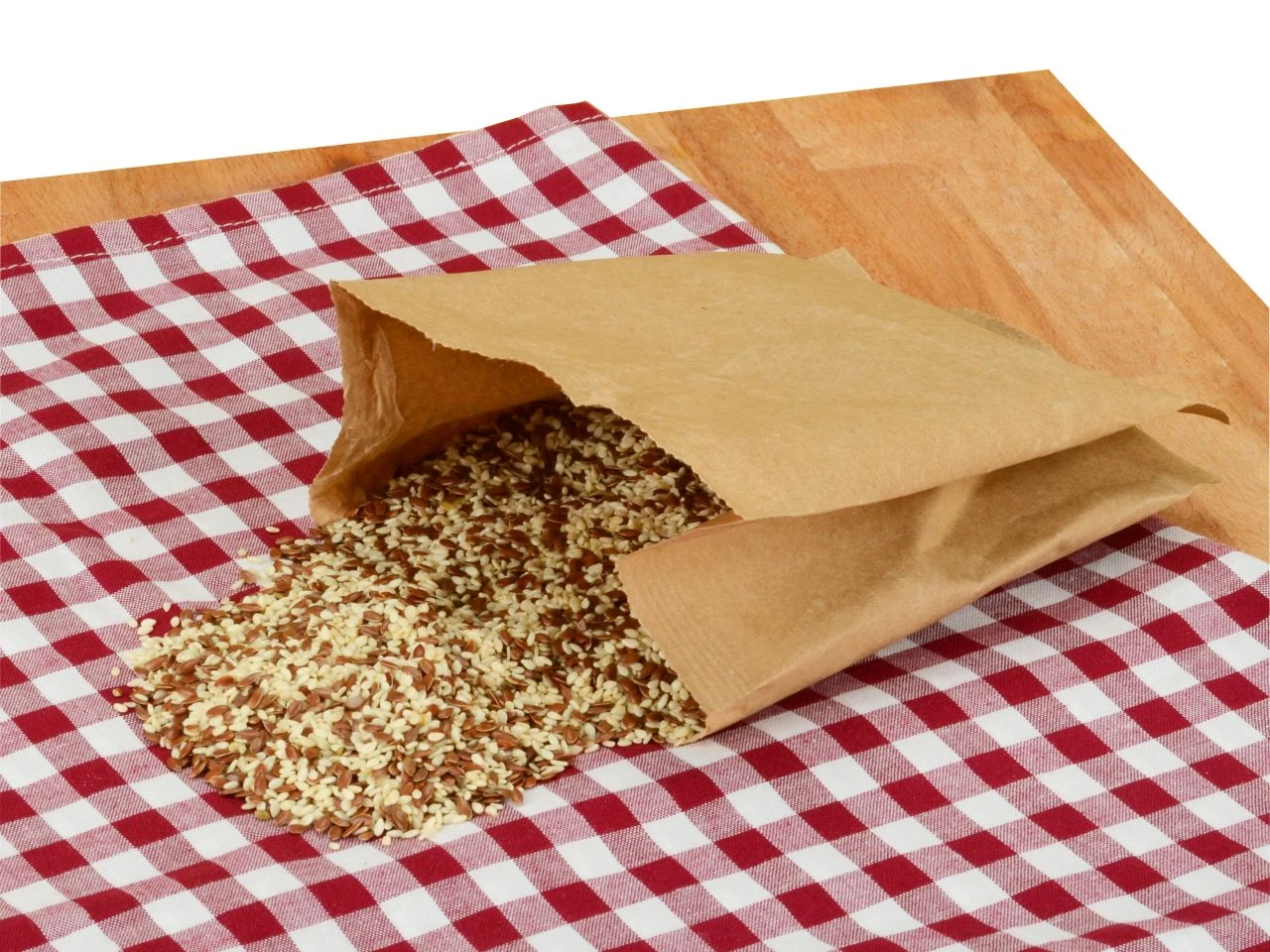 Nachhaltig wird die Sesam-Leinsamen-Mischung zum Backen in einer Papiertüte geliefert. Bitte lagern Sie sie trocken.