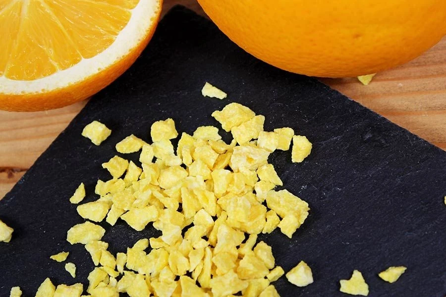 Gefriergetrocknetes Granulat aus leckeren Früchten zur Verwendung in Süßwaren und Cerealien. Die kleinen, gelb bis orangefarbenen Granulatstücke haben den charakteristischen Geschmack der Orange. 100 g des Produktes entsprechen ca. 400 g frischen Früchten. Sehr geschmacksintensiv.