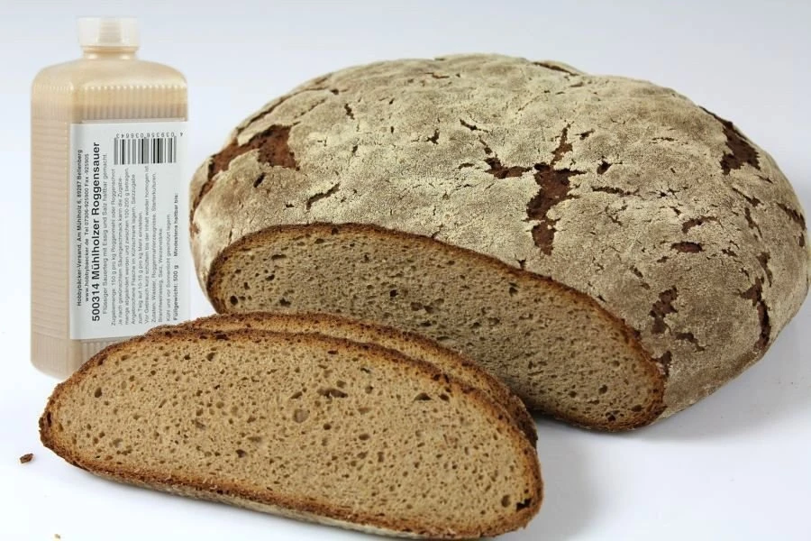 Der Mühlholzer Roggensauer sorgt für beste Brotqualität und ist durch seine flüssige Konsistenz leicht zu dosieren. Er verfügt über ein optimales Milch-Essigsäure-Verhältnis. Haltbar gemacht wurde er aus der klassischen Dreistufen-Führung ohne Erhitzen. Er ist aus dem Kühlschrank heraus immer einsatzbereit und garantiert sichere und gleichbleibende Sauerteig-Qualität. Die fertigen Brote und Gebäcke erhalten einen typischen milden, säuerlich-aromatischen Geschmack. Zugabe: 150 g pro kg Roggenmehl oder Roggenschrot. Je nach gewünschtem Säuregeschmack kann die Zugabemenge abgeändert werden und zwischen 100 – 200 g betragen.