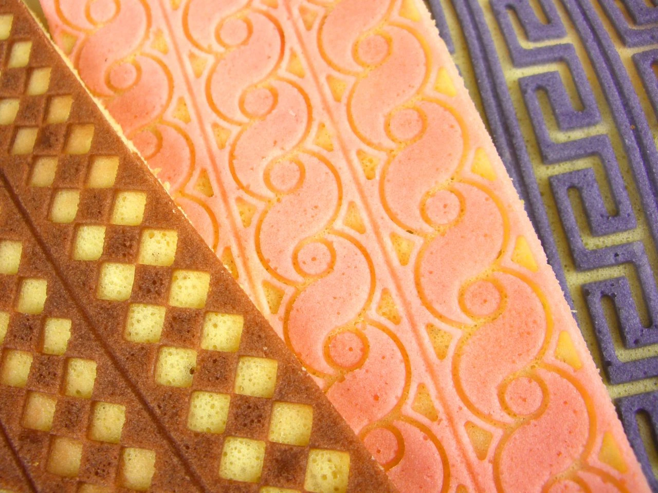 - Farbig strukturierten Biskuit-Teig als Biskuitrolle verwenden oder in Streifen Schneiden und an den Rand von Torten dekorieren.