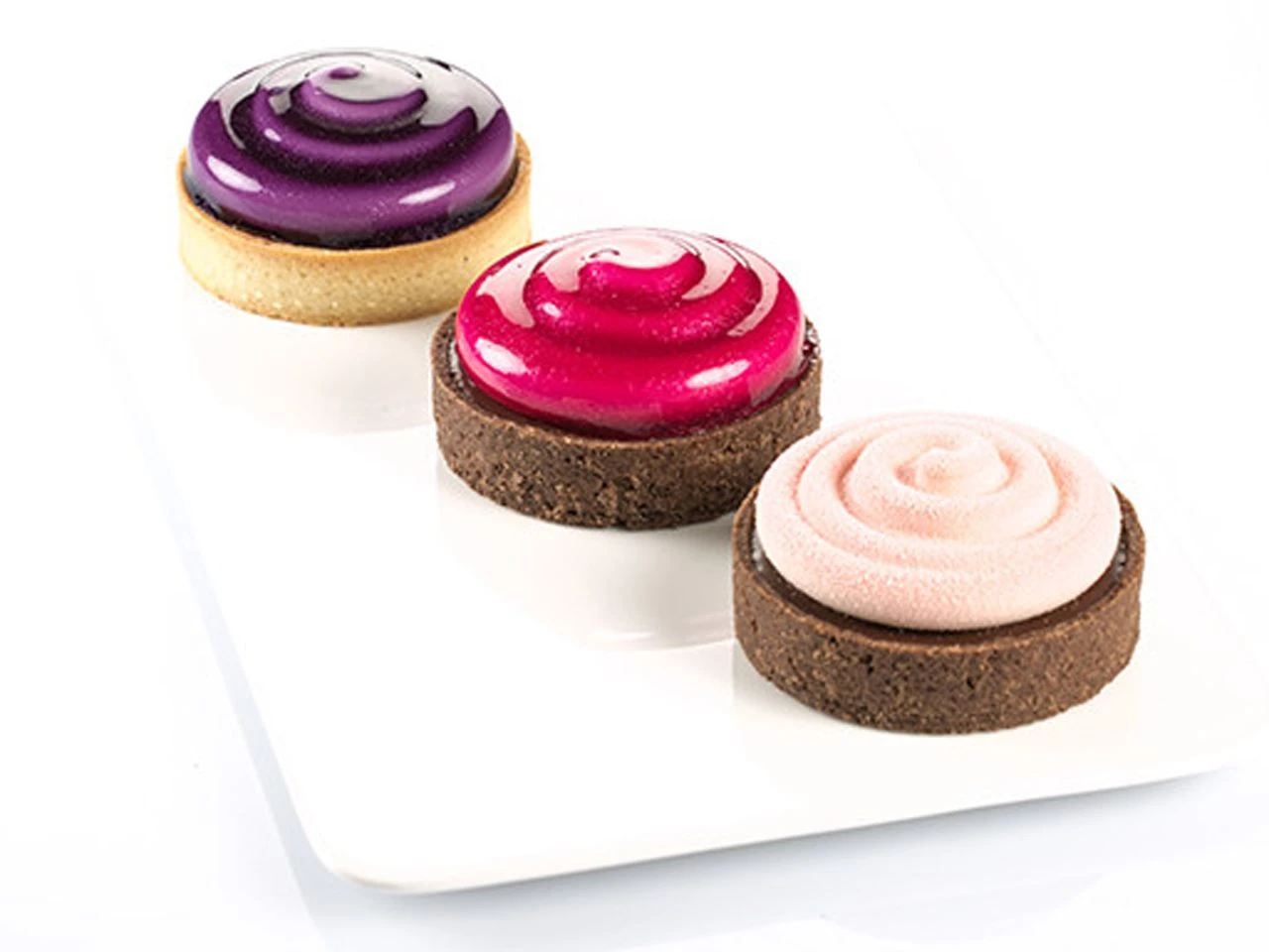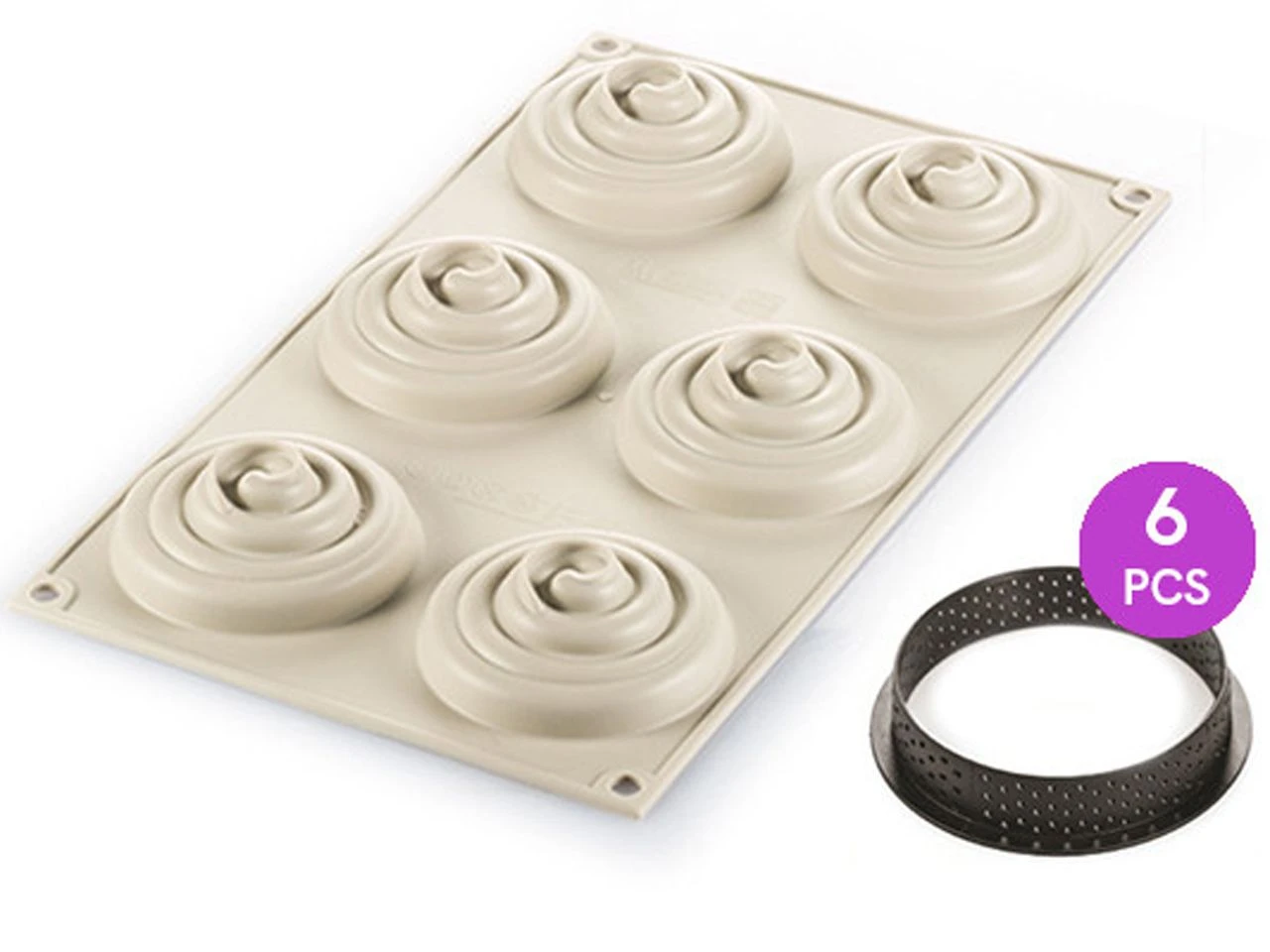 Eine neue Art eine Tarte zu konzipieren und diesen traditionellen Nachtisch noch einnehmender und zeitgemäßer zu machen. Das KIT MINI TARTE TWIST von Silikomart besteht aus 2 Teilen: 6 mikroperforierte Ringe um die Mürbeteig-Hülle zu erschaffen, und eine Silikonform welche eine Spirale abbildet. Die speziellen Ringe mit einem Durchmesser von 80mm bestehen aus einem neuartigen, nicht haftenden Kunststoff Material welches sich perfekt für ein gleichmäßiges Backergebnis eignet. Das Set Mini Tarte Twist ist ein regelrechtes Konzentrat von Süße und Gegenwärtigkeit um auf wirklich einfache Weise moderne Crostatas zu realisieren, bereichert durch eine herausragende Dekoration.