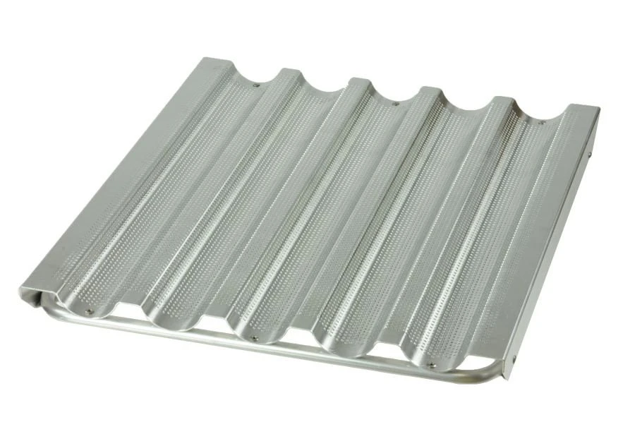 Wer gerne schlanke Stangenbrote bäckt, sollte zu diesem Profi-Modell mit fünf Längsmulden greifen. Das Aluminium-Lochblech mit stabilem Rahmen empfiehlt sich durch hochwertiges Material und solide Verarbeitung. Bitte messen Sie nach, ob das Blech in Ihrem Küchenherd auf das Gitter passt. Unser Stangenbrot-Backblech ist bis 300°C hitzebeständig.