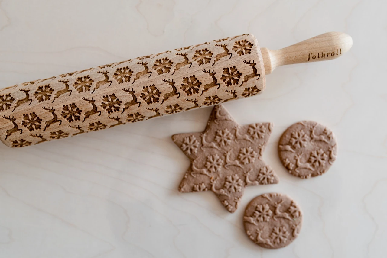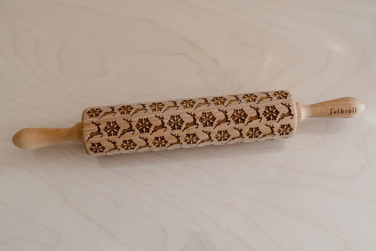Der Teigroller mit der Prägung Rentiere und Schneeflocke ideal für Weihnachtsplätzchen