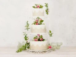 Zauberhaft ist die dreistöckige Etagere für Torten und Kuchen mit gebogenem Draht im Vintage-Stil designt. Dieses lässt sich mit Blumen und Schleifen ideal verzieren. Stabil werden die einzelnen Torten auf kristallklaren Kunststoffplatten präsentiert. Prädestiniert ist dieses Kuchengestell für Hochzeiten, Taufen, hohe Feiertage und besondere Festtage.