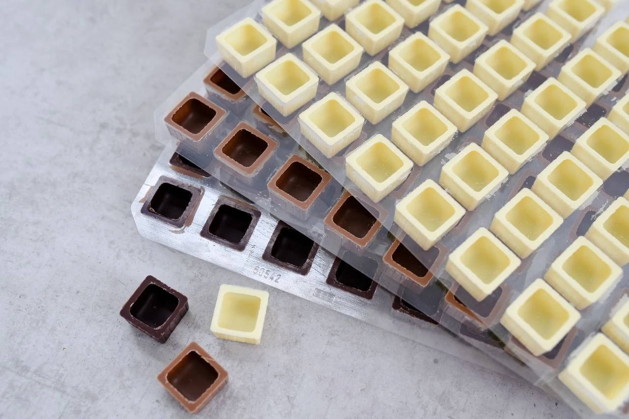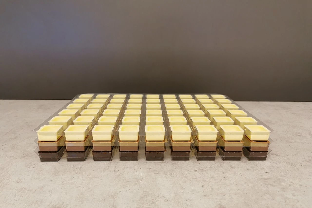So schnell haben Sie noch nie Pralinen gemacht. Einfach die Viereckschalen füllen, schließen und fertig ist der Genuss. Je eine Lage Viereckschalen aus Vollmilch-, Zartbitter- und Weißer Schokolade zum Sonderpreis. Veranstalten Sie doch zusammen mit Ihren Freunden eine kleine Feier „gemeinsam Pralinen befüllen“.